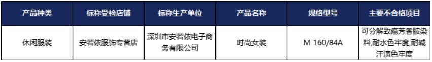 2022年4月,國家市場監督管理總局發布了《2021年休閑服裝等12種網售產品質量國家監督抽查情況通報》。該通報顯示,深圳市安若依電子商務有限公司生產的休閑服裝存在可分解致癌芳香胺染料、耐水色牢度、耐堿汗漬色牢度等三個不合格項目。