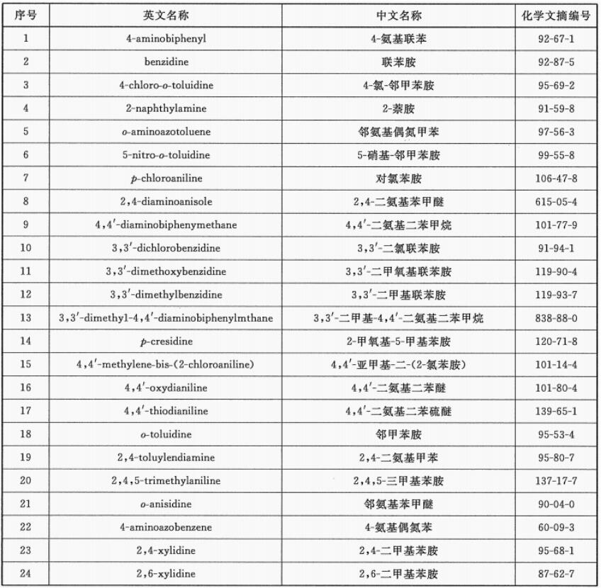 國家紡織品強制性標準 GB 18401-2010 《國家紡織產品基本安全技術規范》中,要求禁用能夠分解出如下24種芳香胺的染料,要求是不超過20mg/kg。
